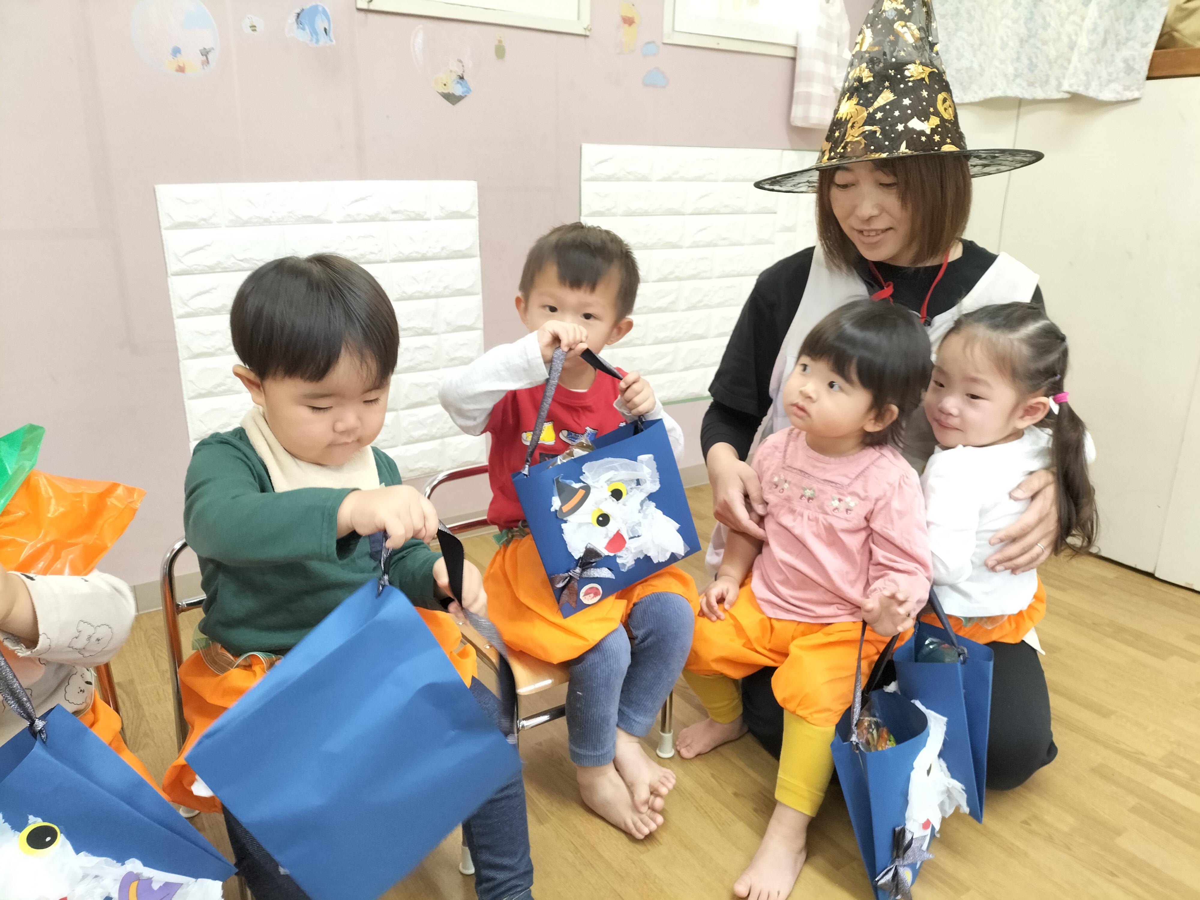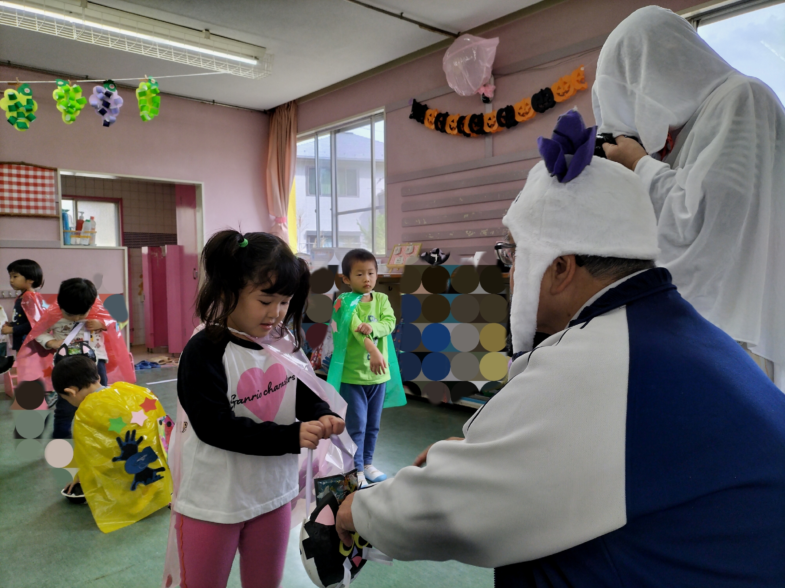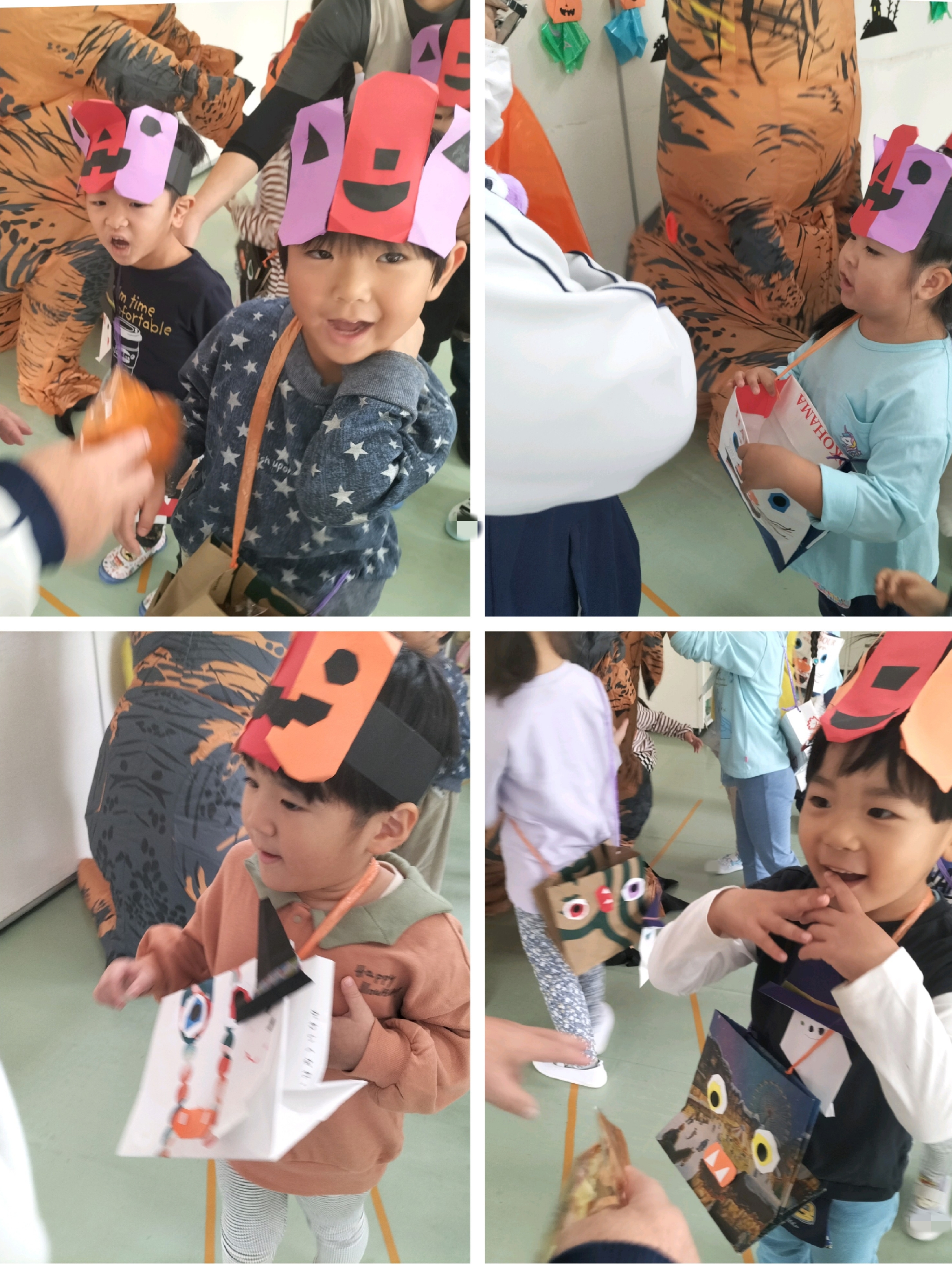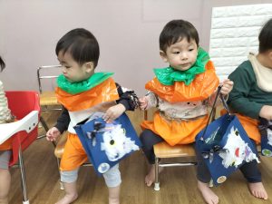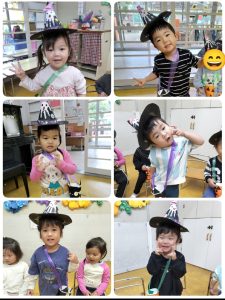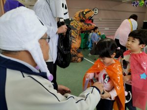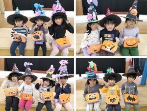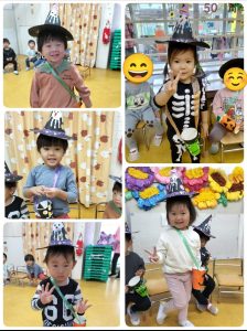 子ども達が一生懸命作った、お面や帽子、マントを付け、お菓子入れをもって準備していると…