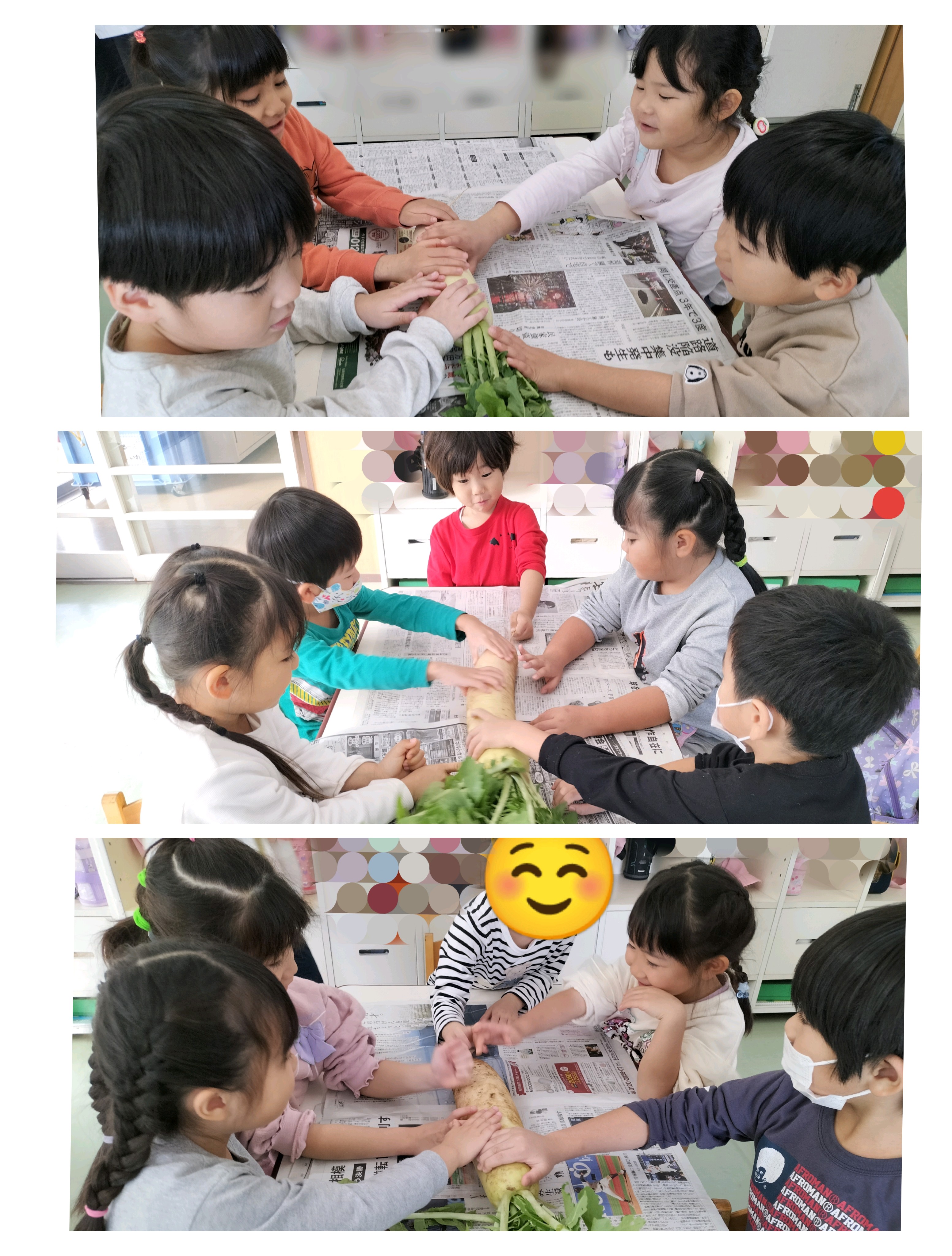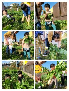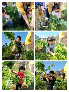 園では初めて見る大根畑に「わぁー、こんなにいっぱいある。」と目をキラキラさせる子どもたち。葉の付け根を持ち、真っ直ぐ抜くコツを教わりいざ収穫。太くて大きな大根を掘る子。細くて小さな赤ちゃん大根を掘る子。·····と大きさは様々でしたが楽しく収穫することが出来ました。