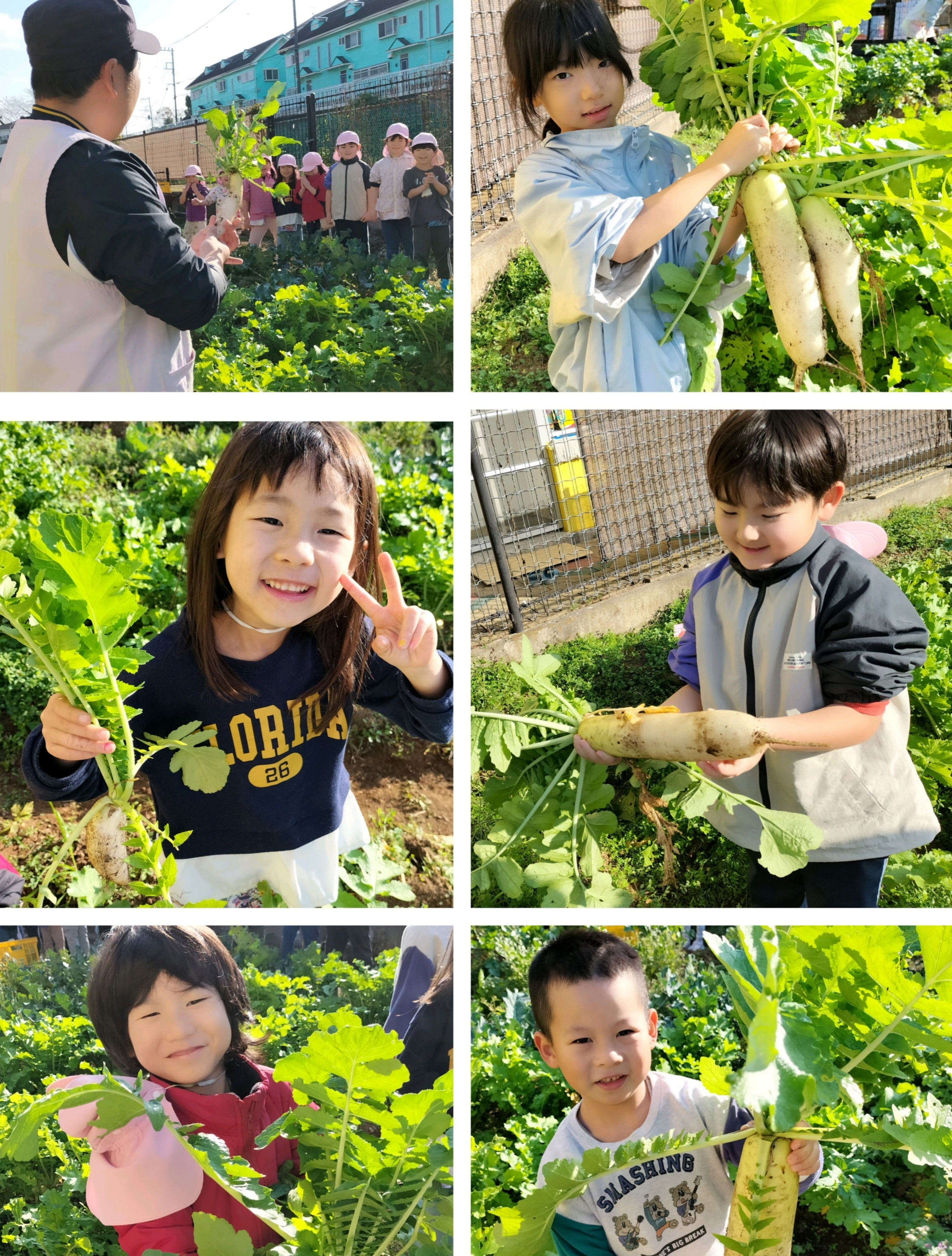 ひよこ組前の畑を優一郎先生が管理してくれて、夏の終わりに種をまいて育てた大根!葉っぱが立派に生長し、今日ついに収穫の時を迎えました。