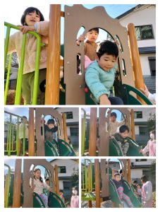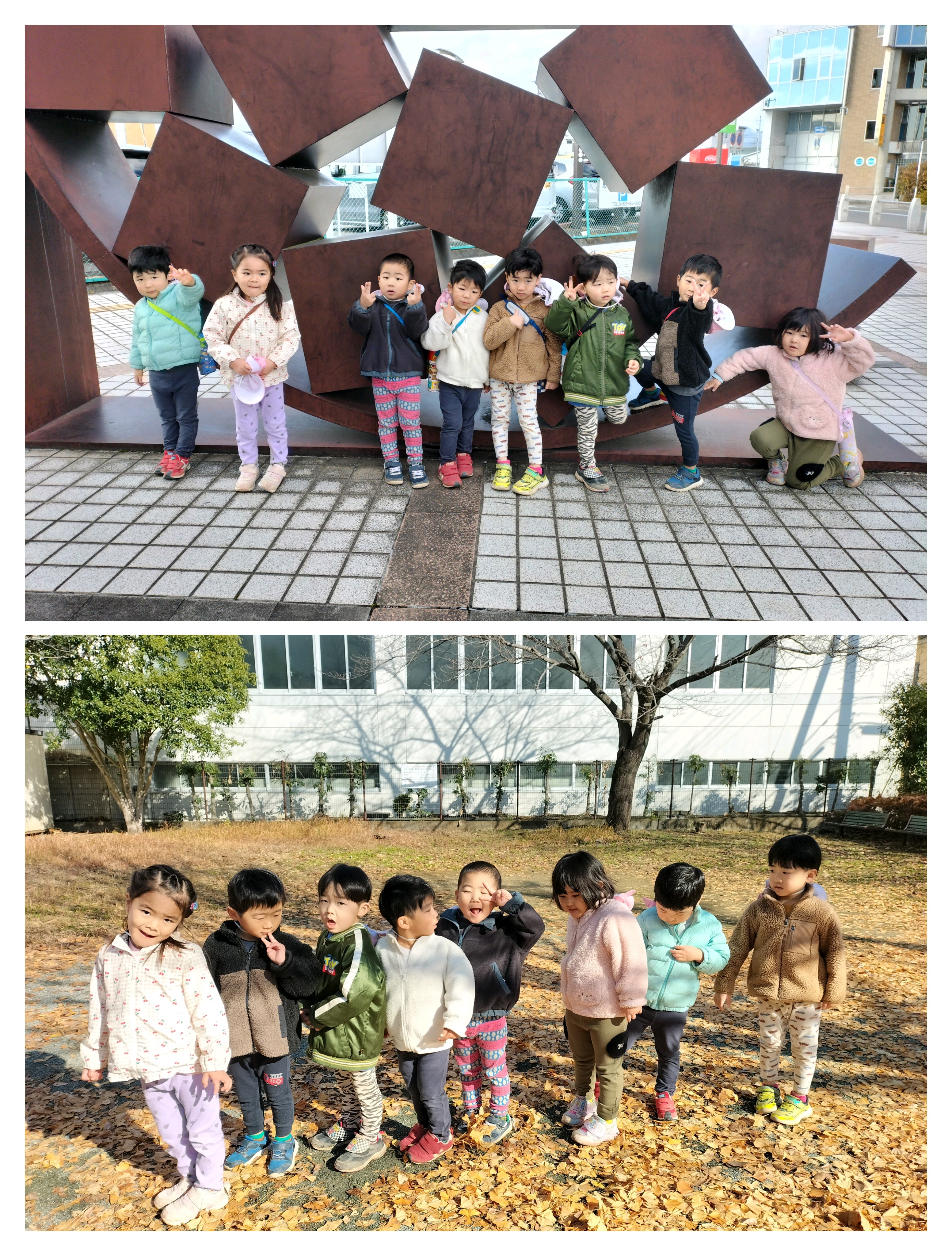 「あっ、マックだ!」「プリキュアのシュークリーム!」等々お店やポスターをみて会話が弾む子ども達。お店の前にあったお正月のお飾り、自動券売機、改札、を見たり興味津々の子ども達でした。帰りに室町公園に寄り、滑り台を楽しみました。滑ると音がして…「なんだ?なんだ?」と、それがまた、楽しかったようです😊