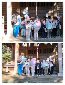 参拝の仕方をみんなで確認してから、一人ずつお賽銭を入れ、参拝しました。