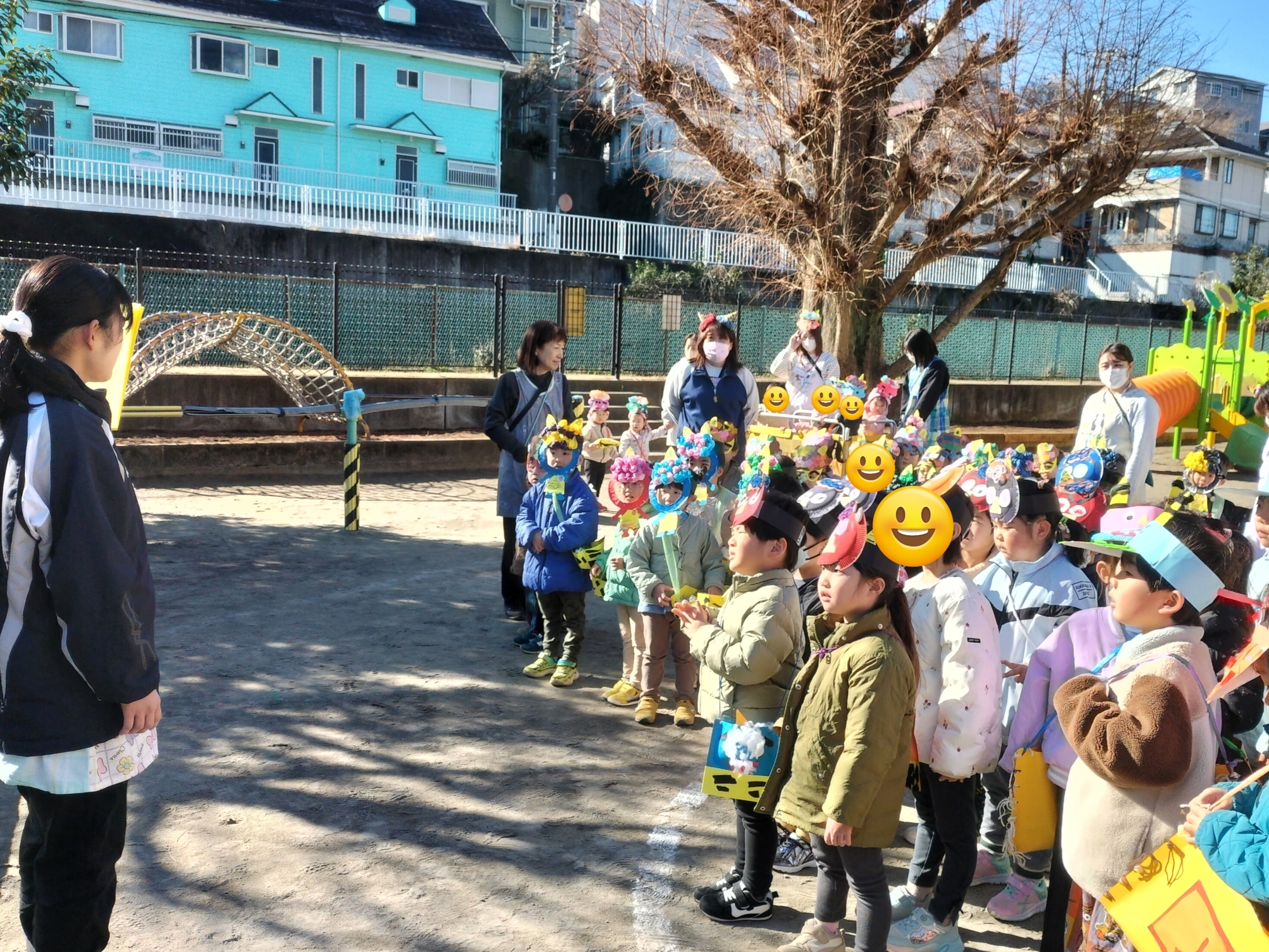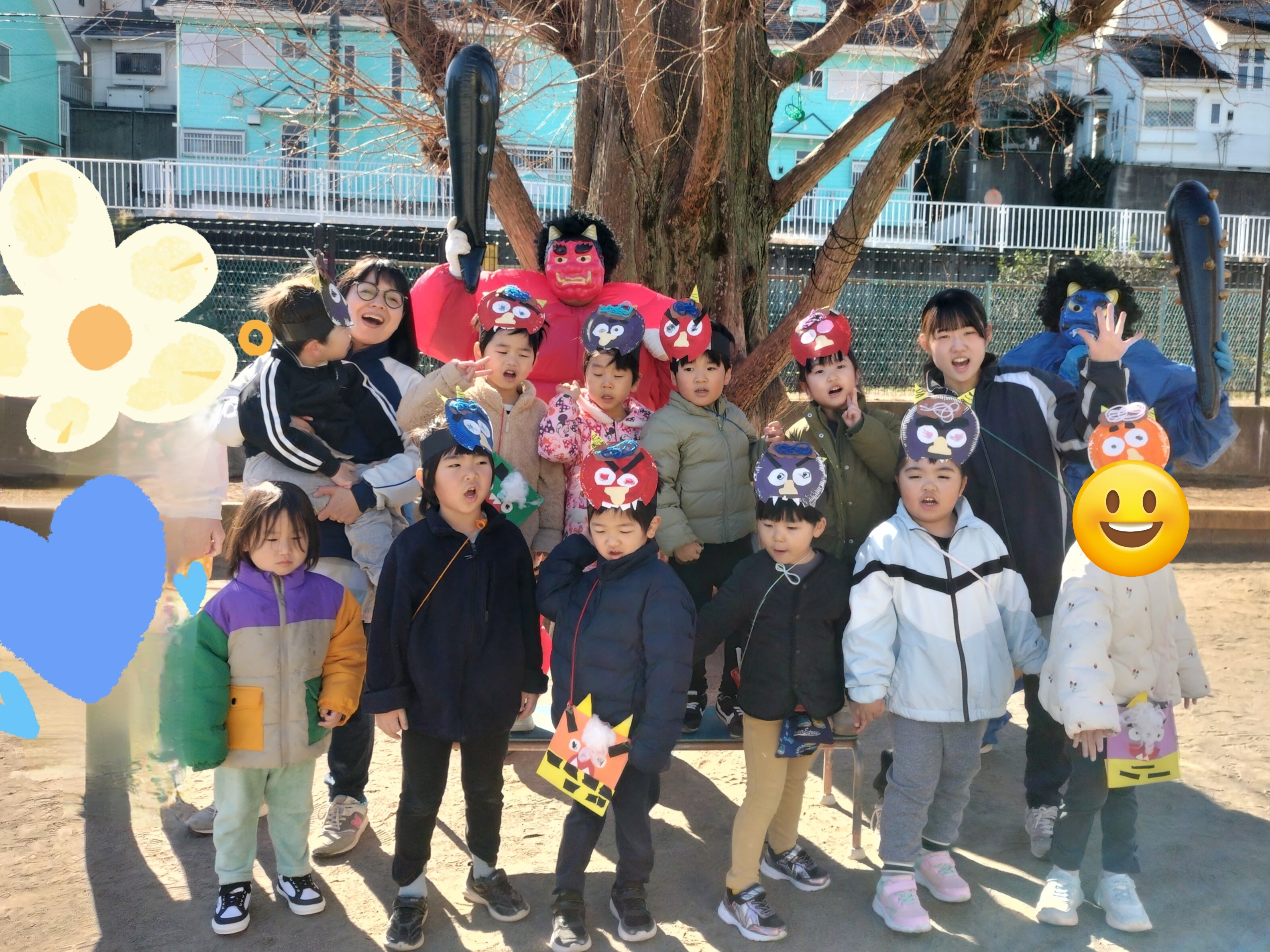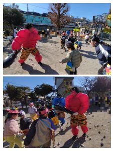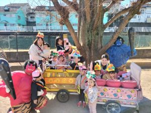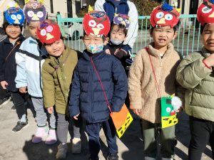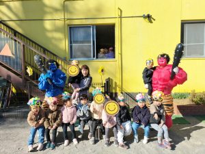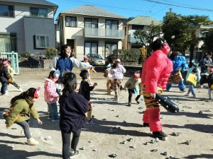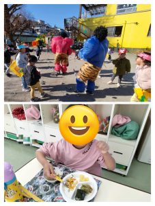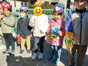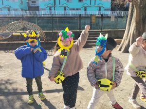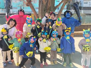 1週間前から幼児クラスに弘法山から保育園に鬼が近づいてくる写真を掲示し、鬼が来るのを楽しみにする子、「怖い!」とドキドキな子もいました。