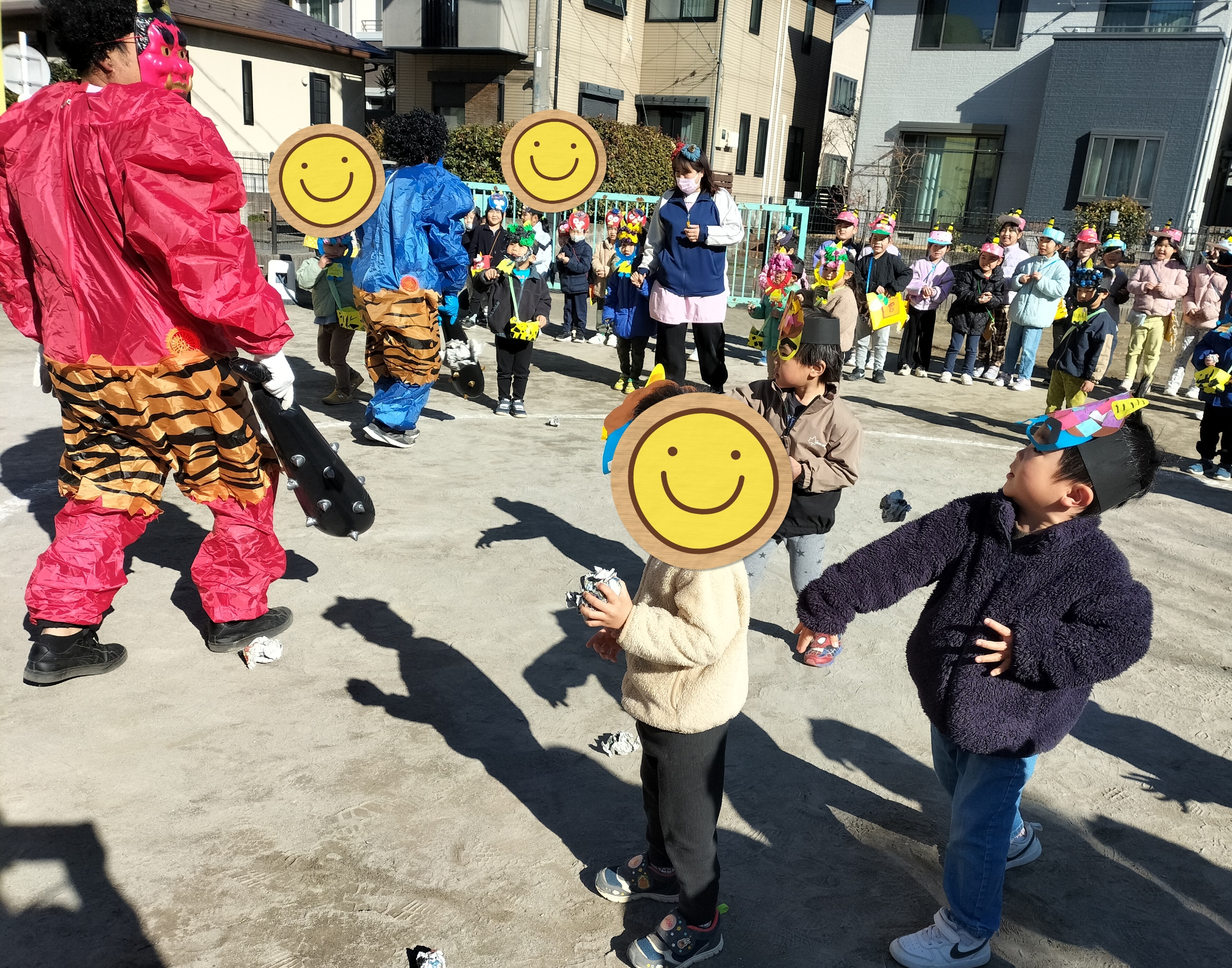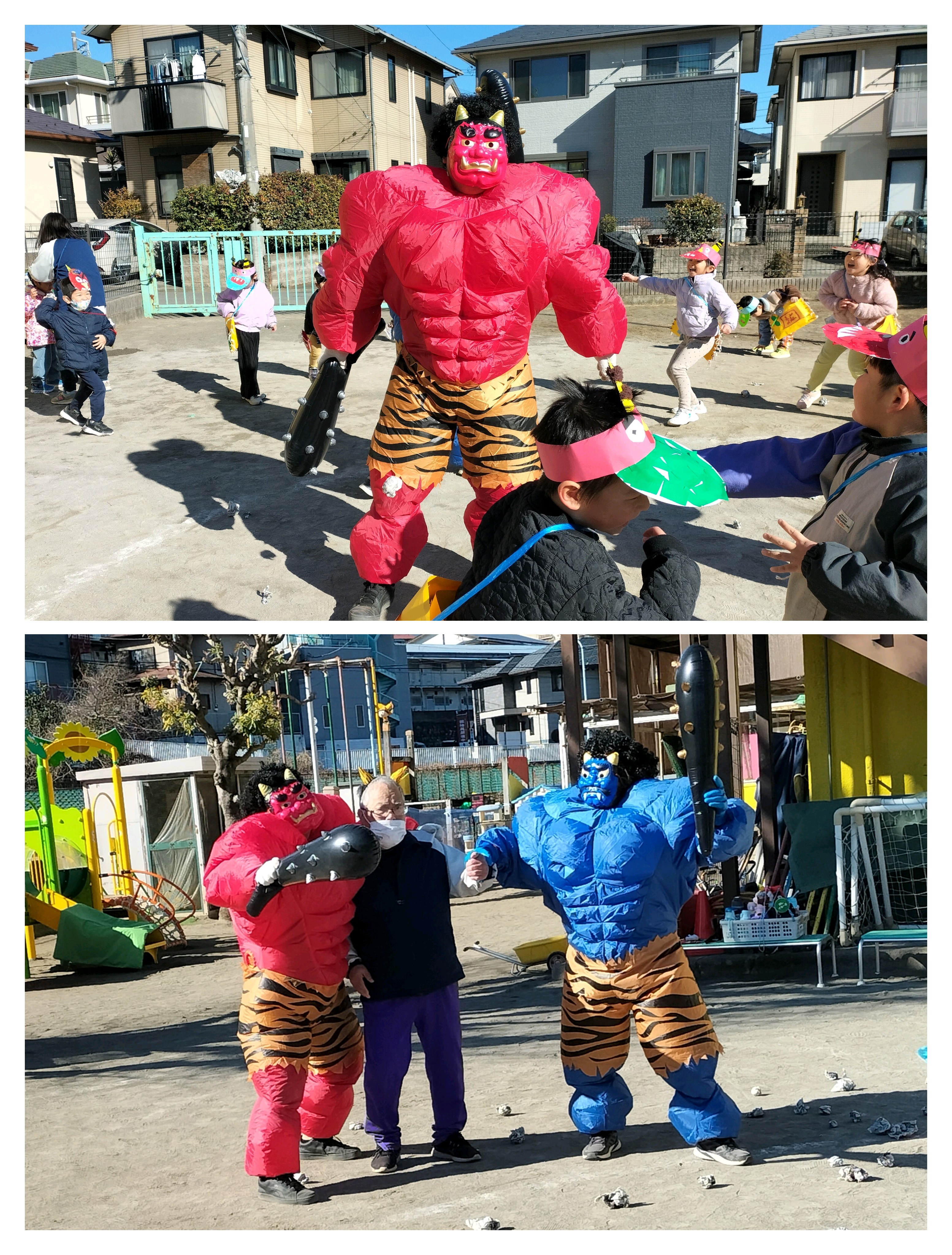 それぞれ作った豆入れとお面を身に着け、節分の由来についてのお話を聞いているとムキムキな赤鬼、青鬼が登場!!