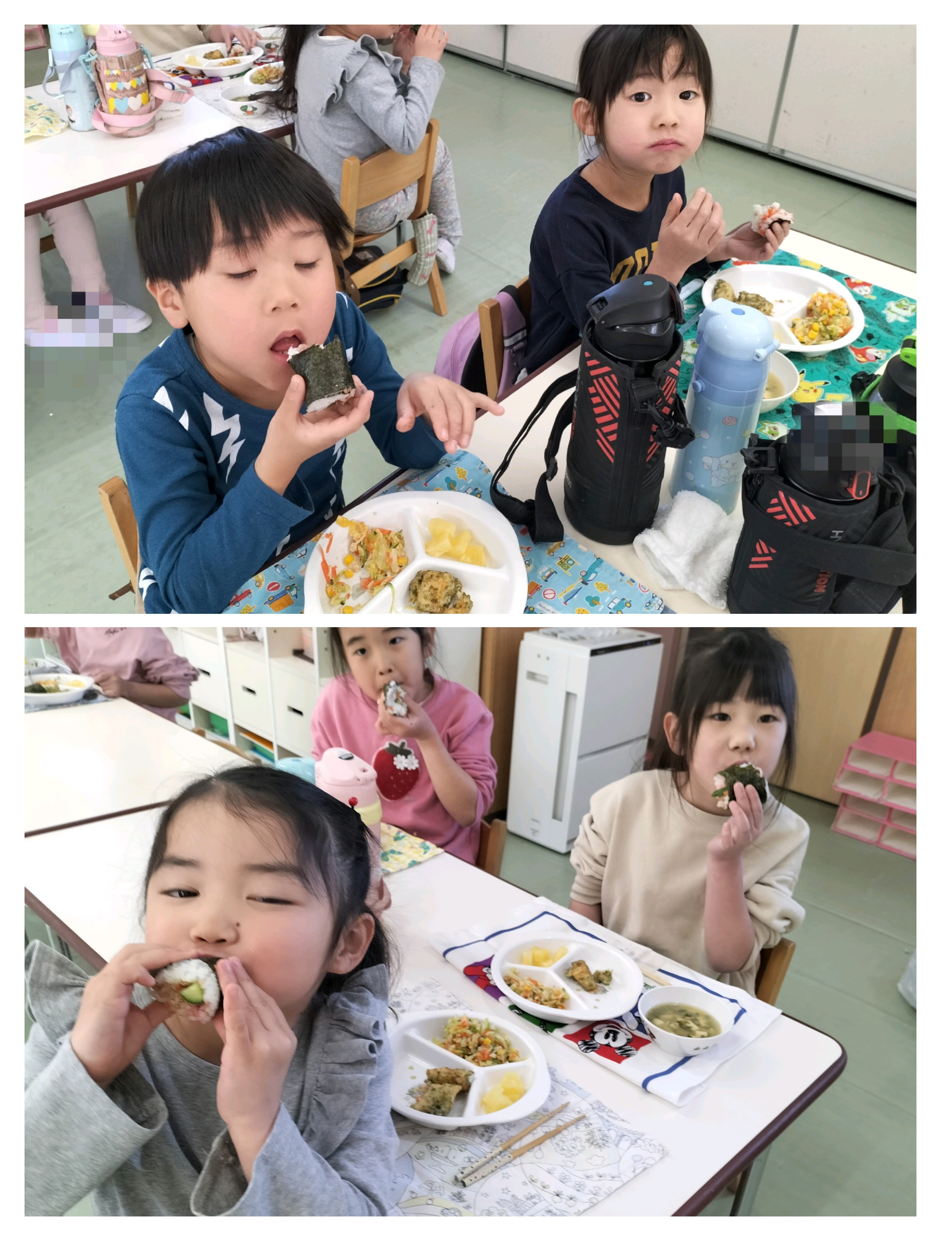 まずはうさぎ組、ぱんだ組のお友だちが鬼退治✨怖がりながらも勇気を振り絞って豆をまく子、怖くて保育者の後ろに隠れてしまう子など、さまざまな姿が見られました😊