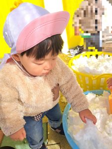園庭に積もった雪で、1歳児のお友だちと一緒に雪あそびをしました。