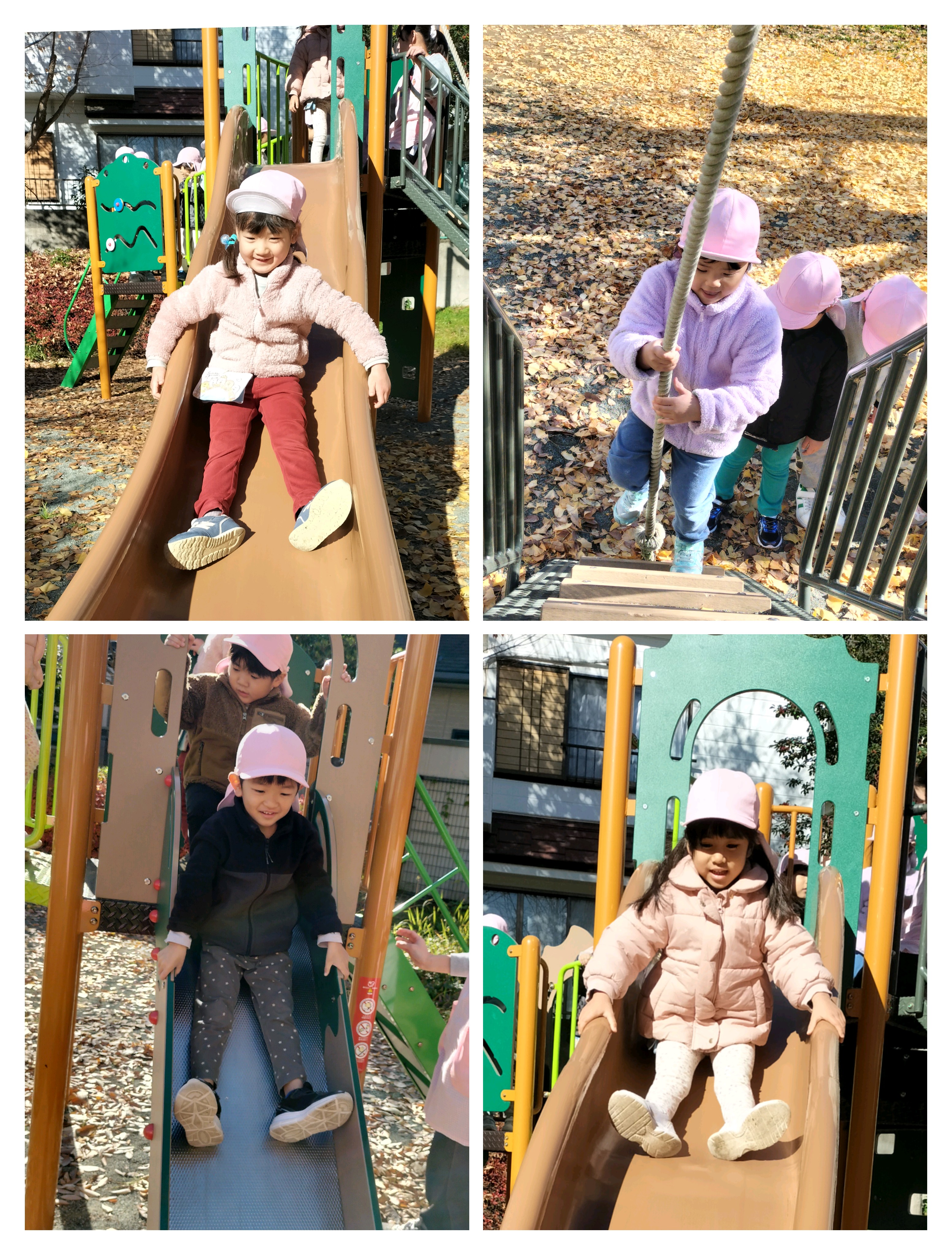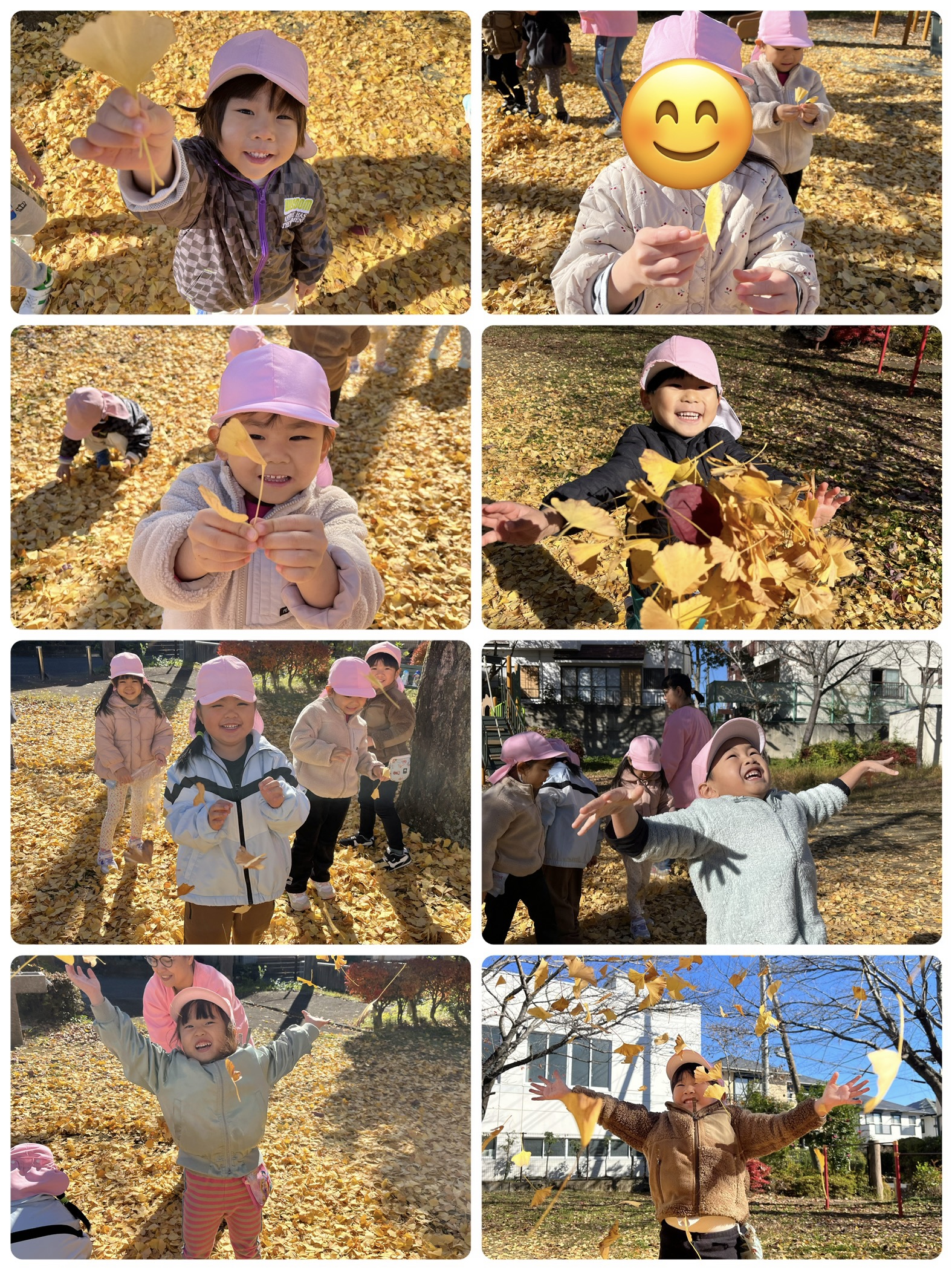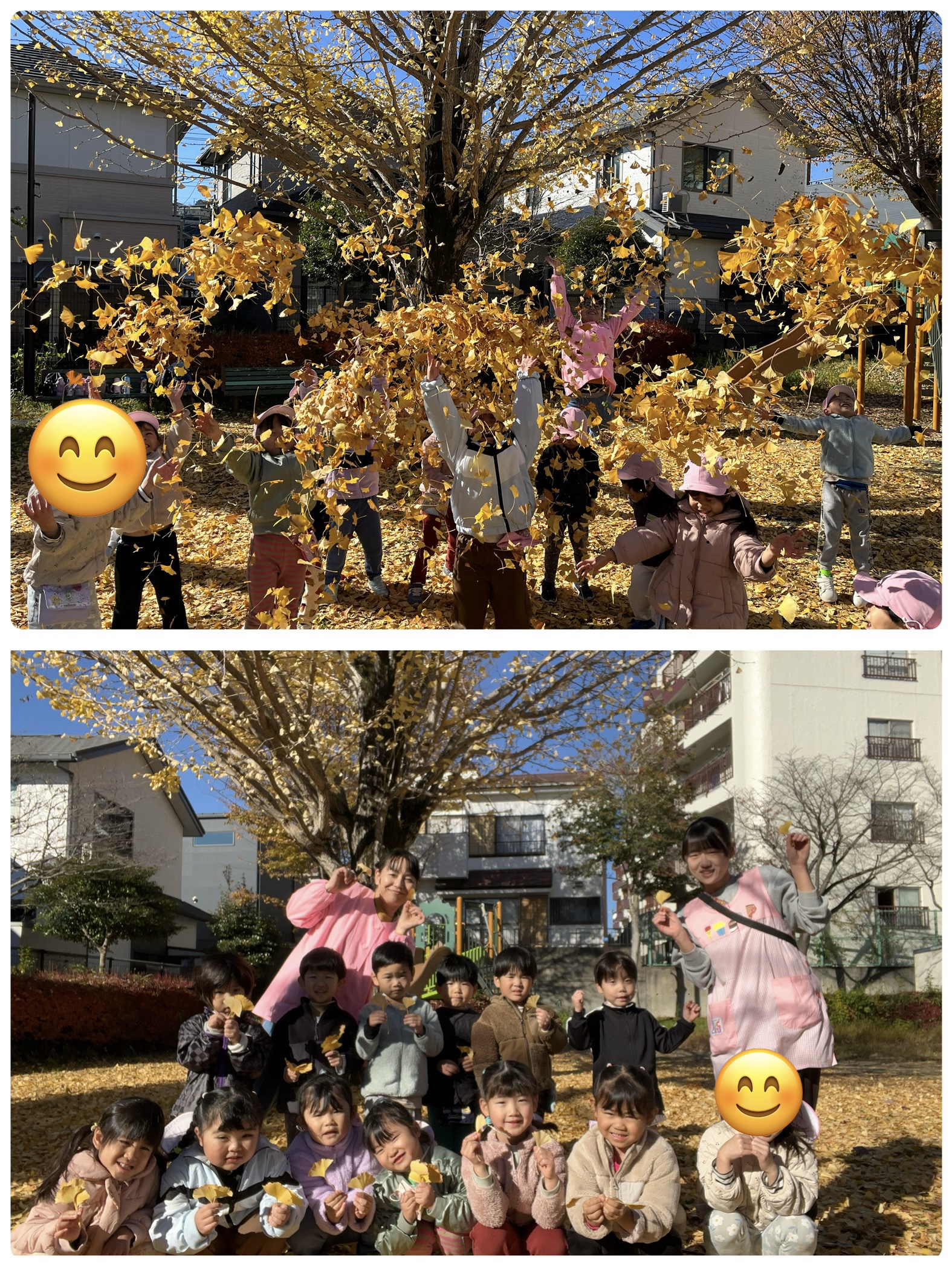 室町公園に到着。イチョウの葉が落ち、黄色いじゅうたんになっていて、葉を袋に集めたり、ひとまとめにしてイチョウの雨を降らせたり、友だちや保育者とかけあって楽しみました✨